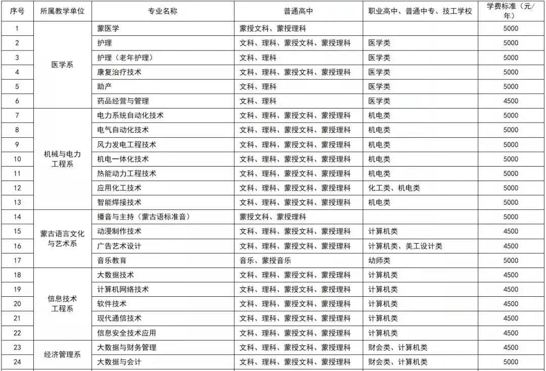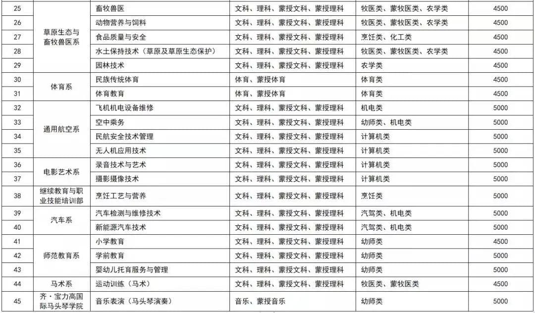 学院开设的46个高职专业(含方向)覆盖现代畜牧业、现代制造加工业、现代服务业、能源动力、交通运输、新闻传播、生物化工、电子信息、财经商贸、医药卫生、民族文化等15个领域,就业岗位分布广泛,所有高职专业均可参加全区专升本考试升入区内本科院校的本科专业继续深造。学院已建成以高等专科职业教育为主,中职教育为辅的现代职业教育体系。曾与内蒙古工业大学、内蒙古师范大学、内蒙古医科大学、内蒙古农业大学、赤峰学院等高校合作举办热能动力工程、电气自动化技术、体育教育(足球方向)、学前教育、蒙医学、食品质量与安全、护理等专业应用本科教育,取得显著成效。